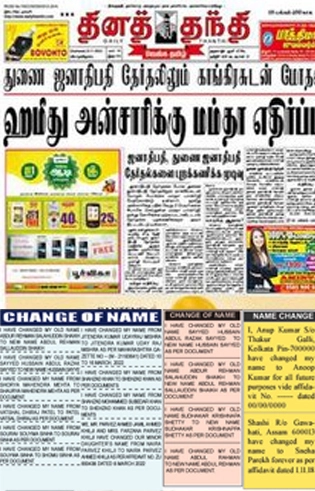 Answer: Yes, for publishing name change advertisement in Dina Thanthi newspapers for passport newspaper, the customer has to submit a copy of the Gazette or a photocopy of the Affidavit. After producing this legally recognized document, only name change advertisements are accepted in Dina Thanthi newspapers for passport.
